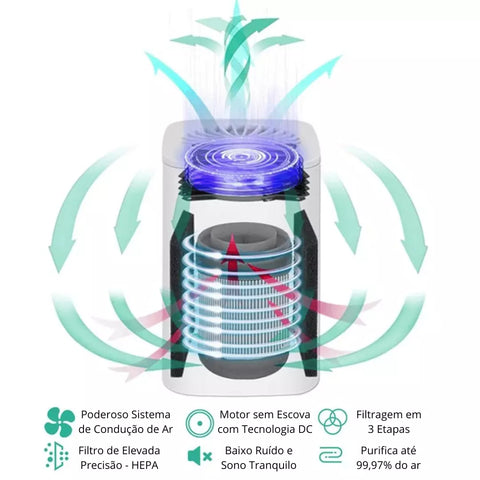 🌿 Com tecnologia avançada, este purificador filtra partículas minúsculas, desde pó e bolor até pelos de animais e poluentes químicos, garantindo um ar puro e fresco.
