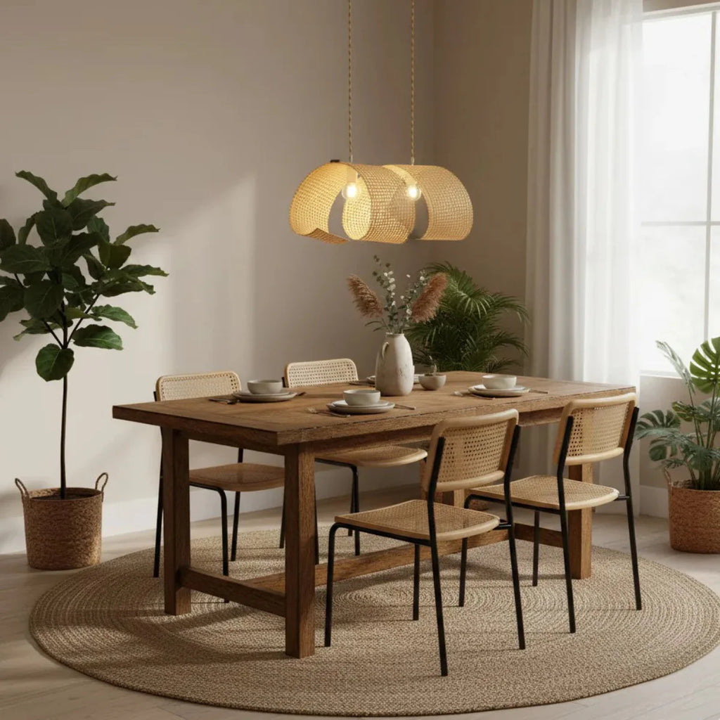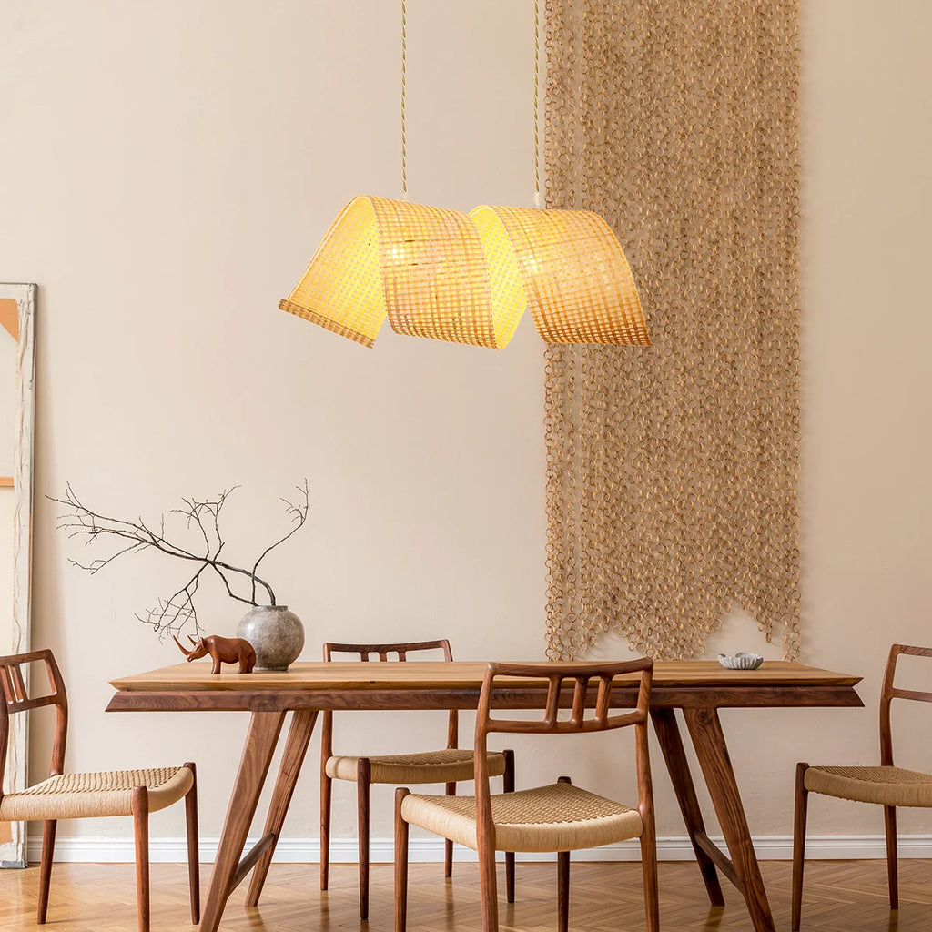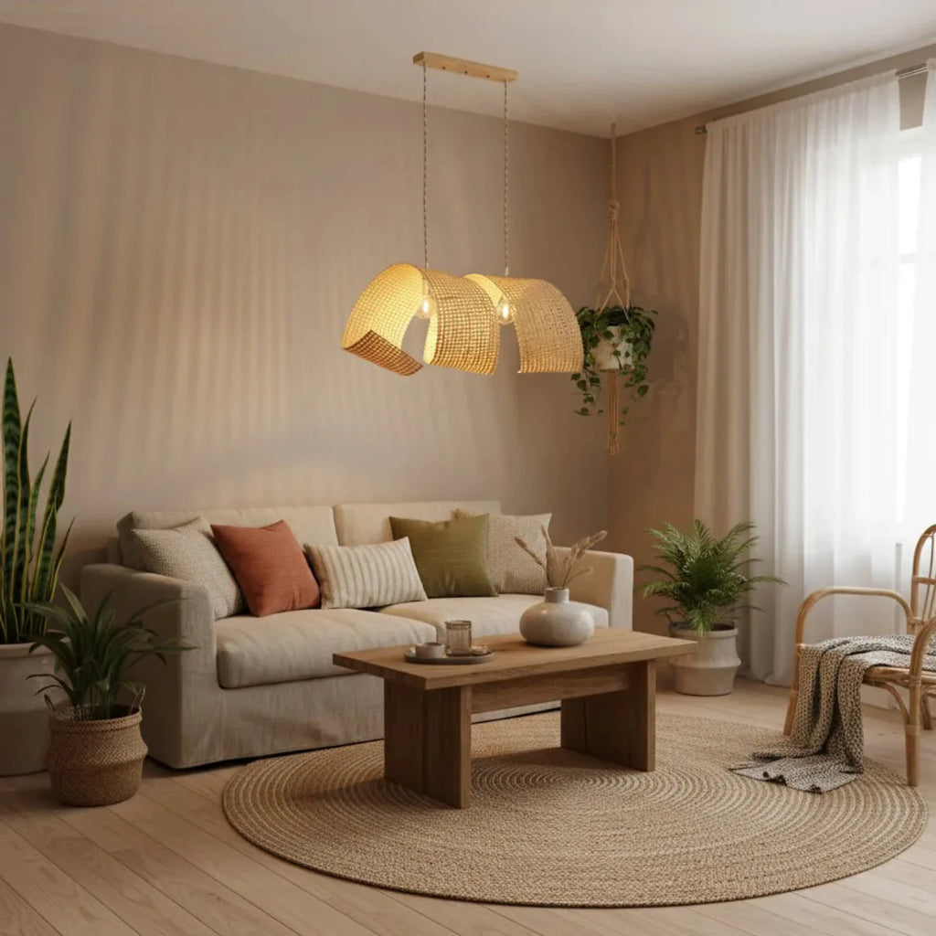 Inspirada nas formas suaves e contínuas das dunas do deserto, a luminária Duna é uma peça de design que transforma a luz em escultura. Seu trançado artesanal em palha natural molda curvas elegantes que criam uma dança de sombras e texturas no ambiente.