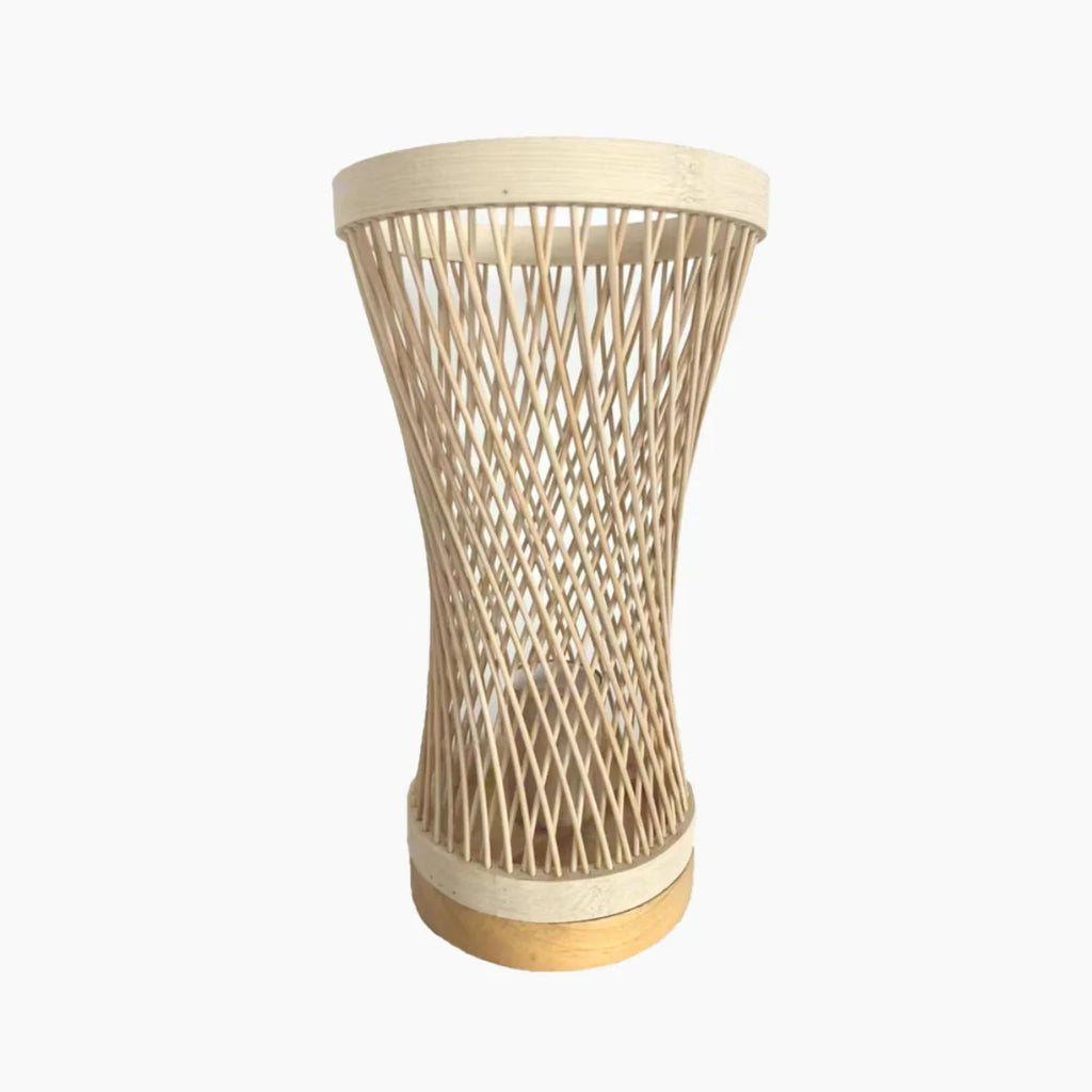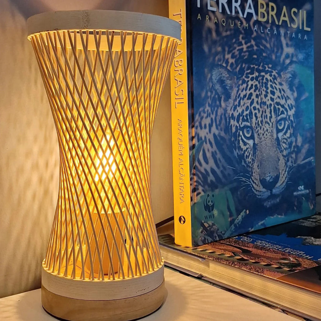 Sua estrutura em espiral, feita de fibras naturais, cria um efeito visual envolvente quando acesa, projetando sombras suaves e delicadas ao redor. Compacta e sofisticada, é perfeita para ser usada como ponto de destaque em mesas laterais, criados-mudos ou estantes, adicionando charme, textura e uma atmosfera acolhedora ao ambiente. Uma peça versátil que une artesanato contemporâneo e funcionalidade com elegância orgânica.